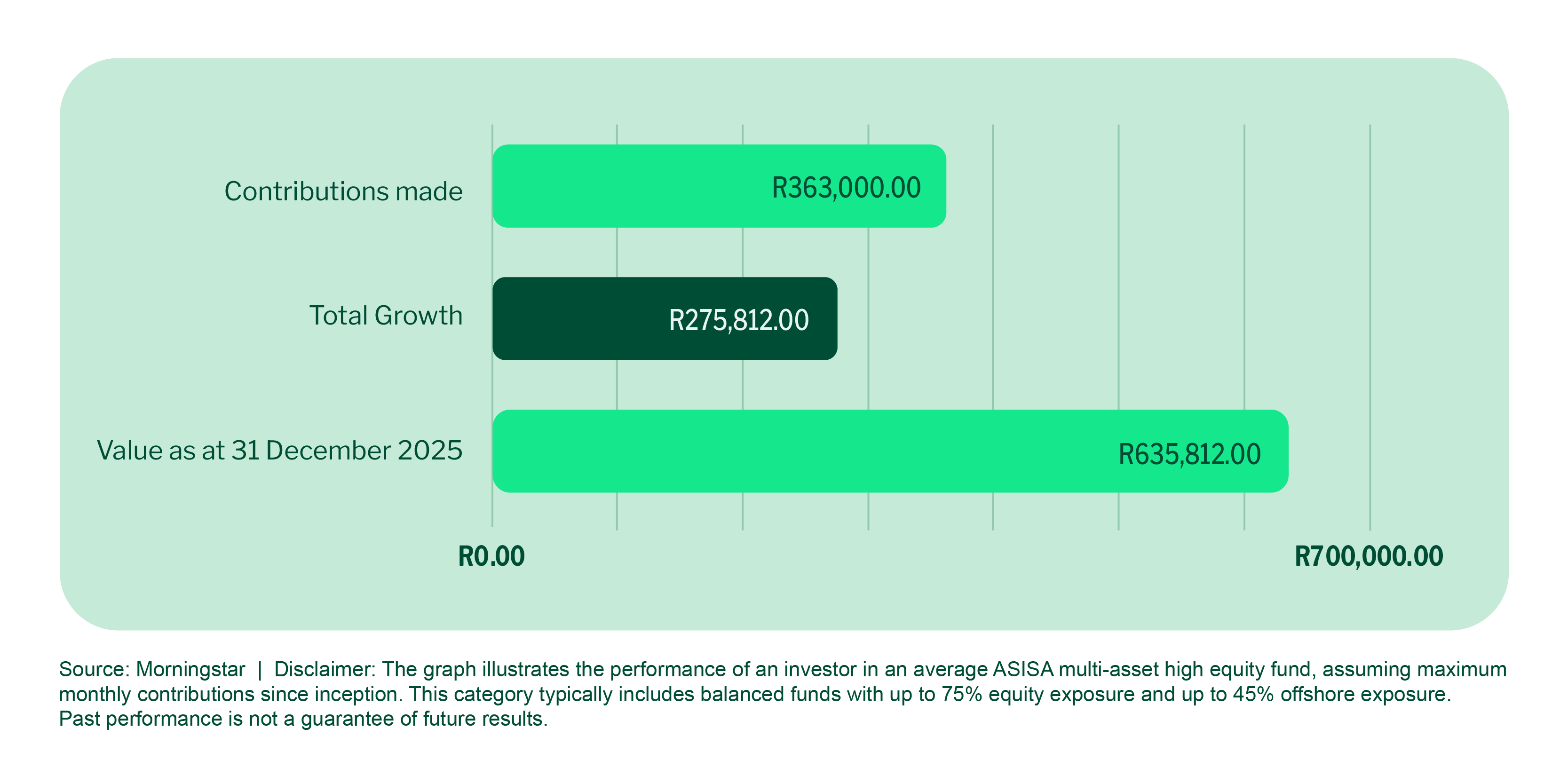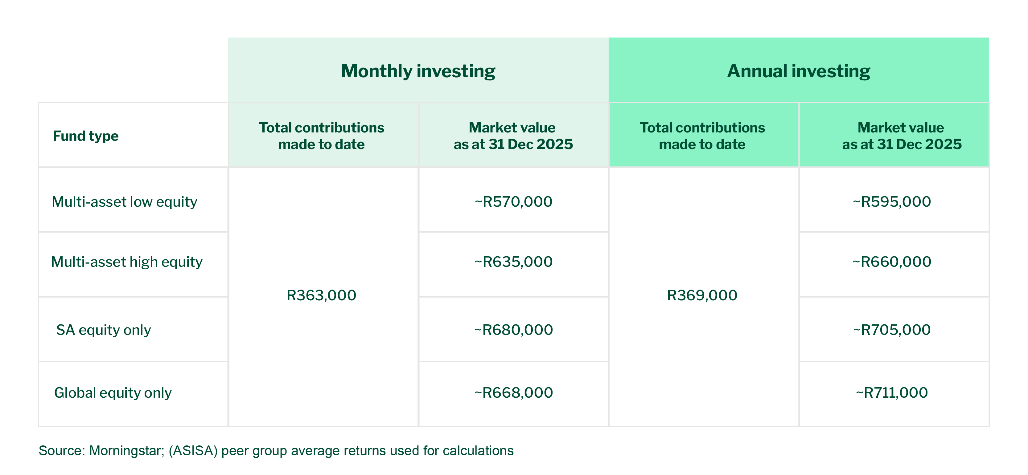 Sometimes the most powerful investing decision is also the simplest one: start early, contribute what you can, and give your investment the time it needs to grow.Investors who began contributing to their TFIs in 2015, and simply stayed invested, are now sitting with balances that few would have expected at the outset. As at 31 December 2025, an investor who consistently used their tax‑free allowance from the start has built a portfolio worth between R570,000 and R710,000, depending on the asset class and contribution approach.